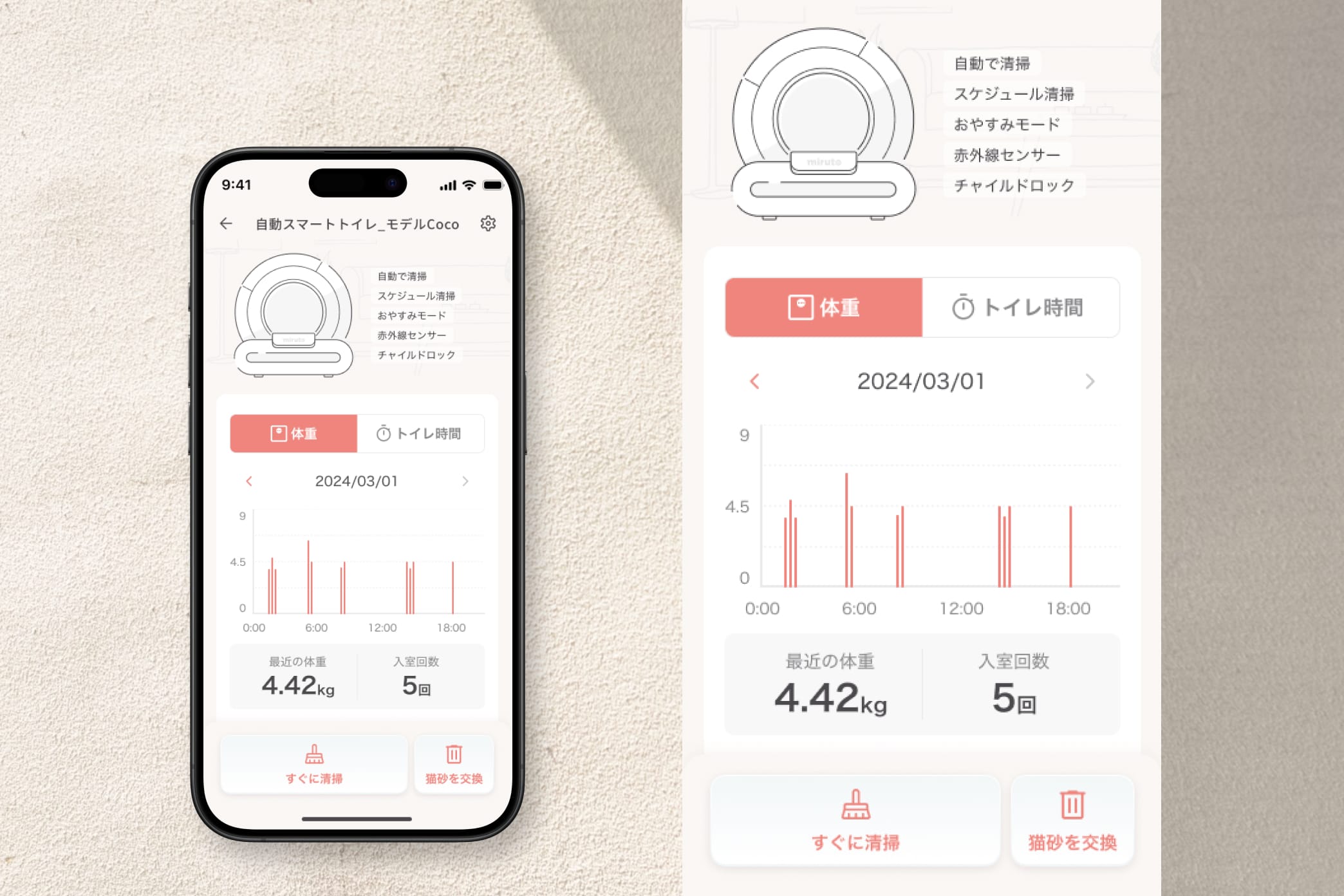猫の体重、トイレの回数・時間、飲水量など、健康のデータを計測・記録することで、体調の変化にすぐに気付くことができます。