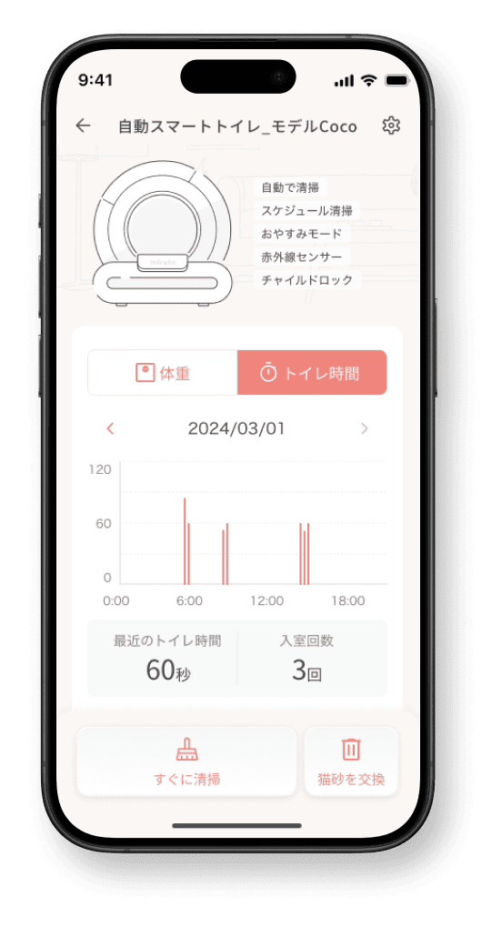 猫がトイレにかかった時間を知ることができます。