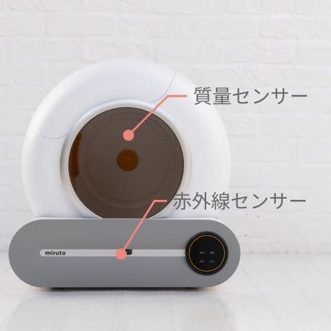 猫がトイレ内にいる時に清掃が始まり、危険な目に合うことを防ぐため、mirutoのスマートトイレには、猫がトイレの周りにいることを察知する「赤外線センサー」と、トイレに入った時に重さで感知する「質量センサー」の二重のセンサーを搭載しています。